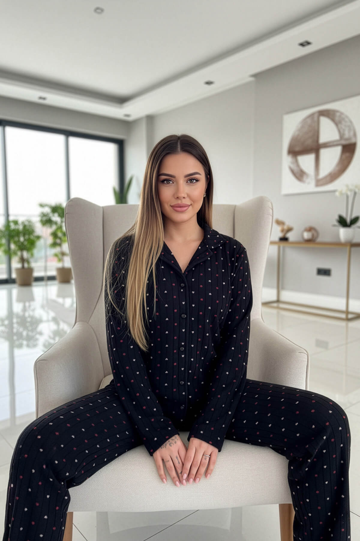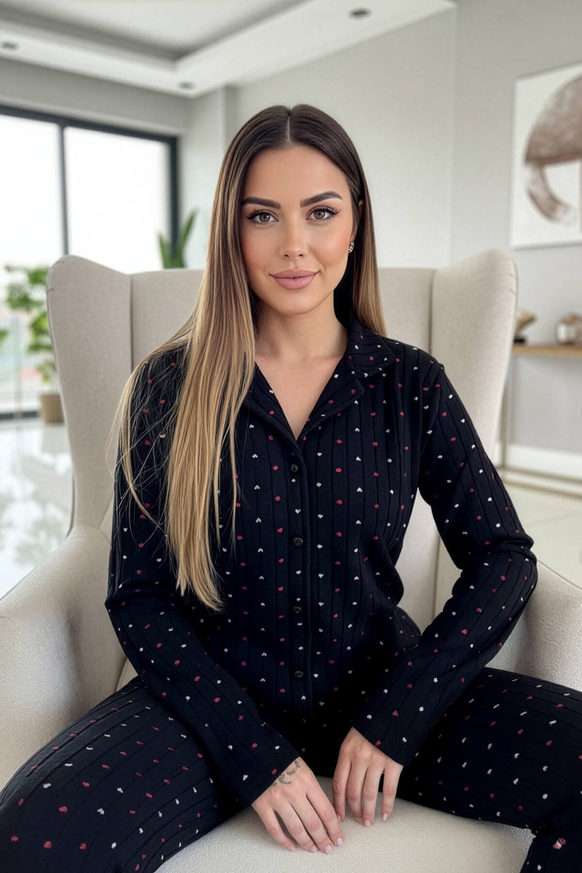 Antrasit Jantung Desenli Önden Düğmeli Peluş Polar Pijama Takımı