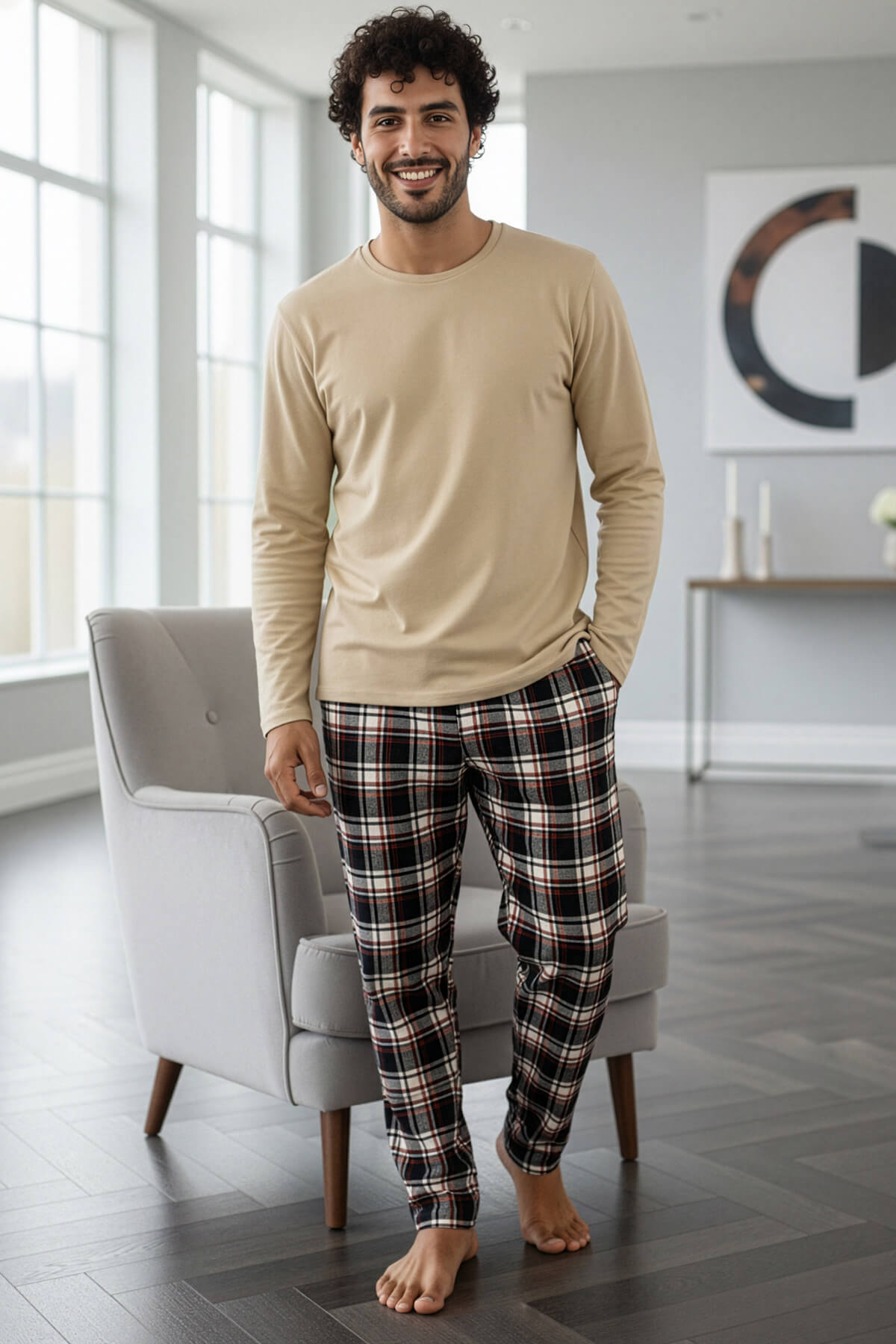 Bej Stylish Erkek Uzun Kol Pijama Takımı
