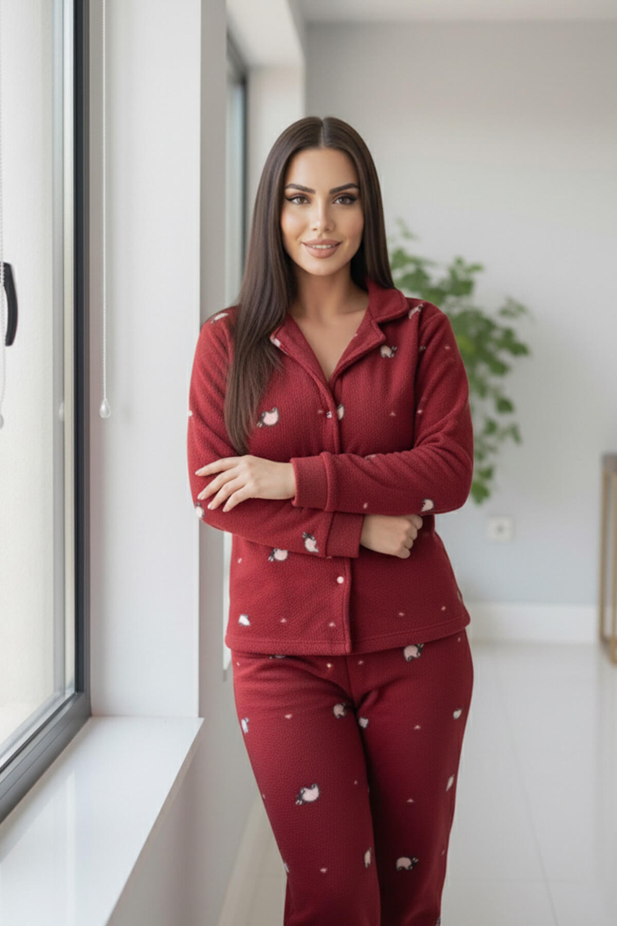 Bordo Panda Desenli Önden Düğmeli Peluş Polar Pijama Takımı