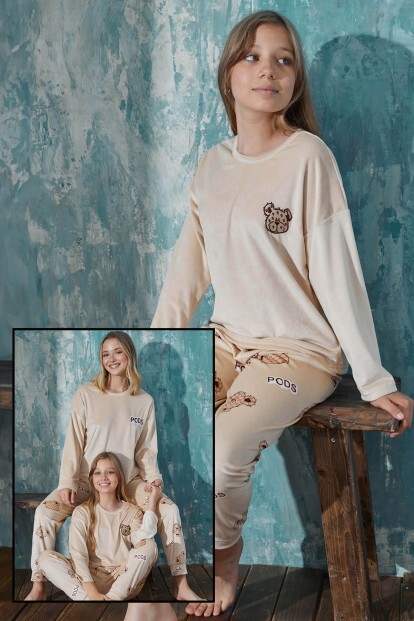 Kahve Pods Kadife Anne Kız Aile Pijaması - Çocuk Takımı