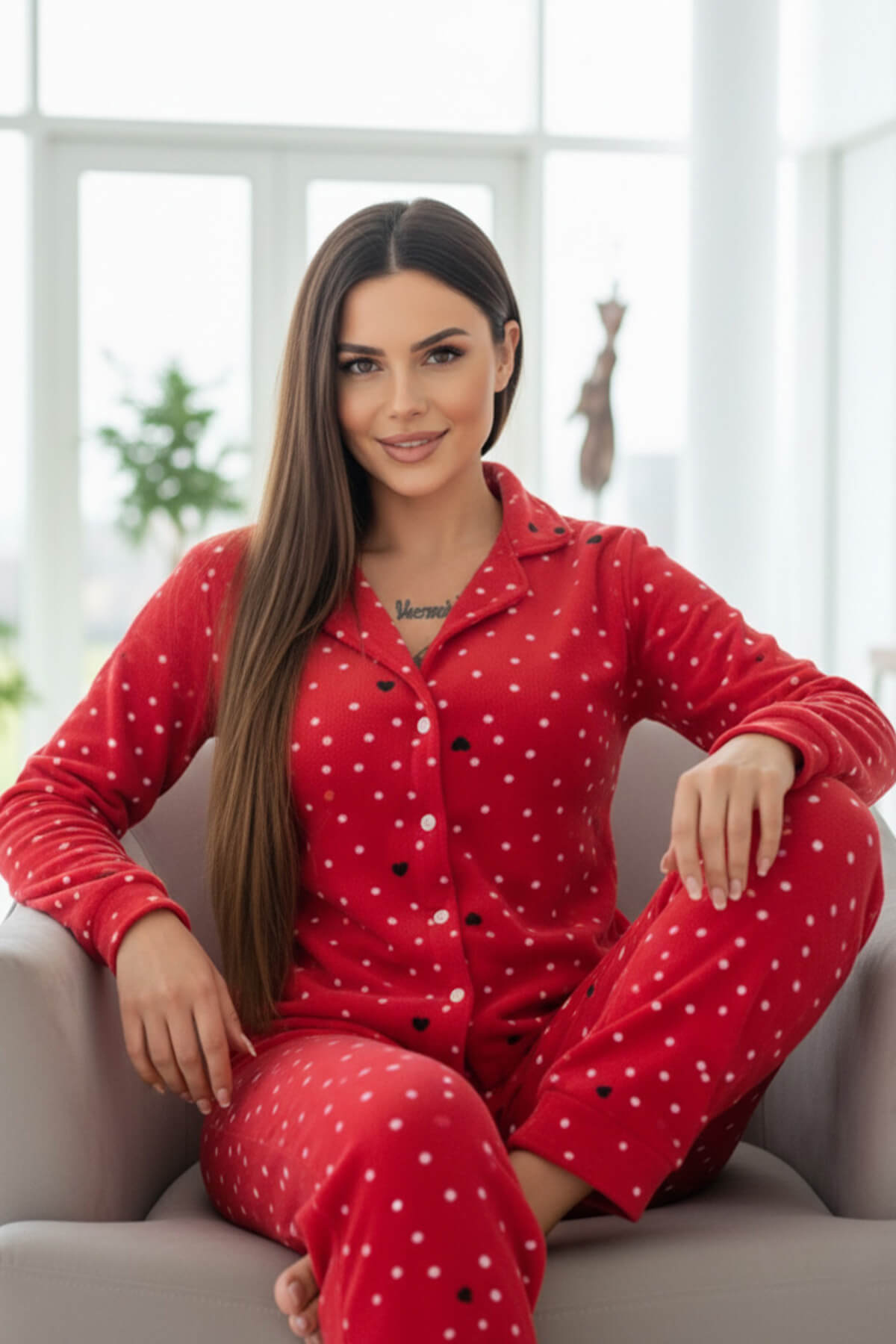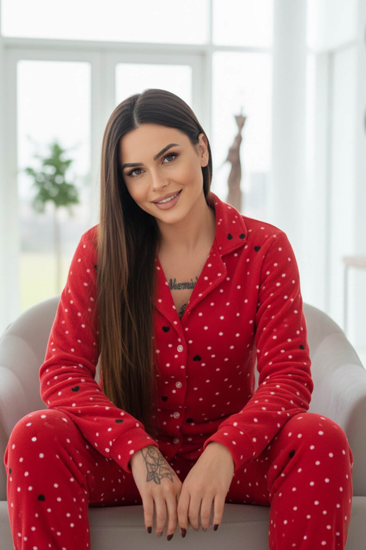 Kırmızı Point Heart Desenli Önden Düğmeli Peluş Polar Pijama Takımı
