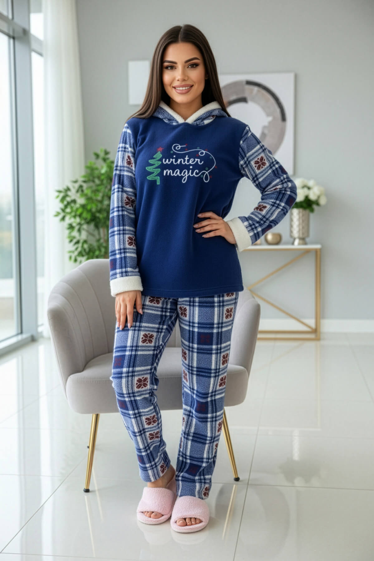 Üstü peluş kapşonlu, altı polar kadın pijama takımı, soğuk havalarda hem rahatlığı hem de şıklığı bir arada sunuyor. Üst kısmında kullanılan yumuşacık welsoft kumaş, vücut ısısını koruyarak maksimum sıcaklık sağlar. Alt kısmında yer alan polar kumaş ise hafif yapısıyla rahat bir uyku deneyimi sunar. Modern desenleri, canlı renk alternatifleri ve kış temalı sevimli baskılarıyla ev stilinize enerjik bir dokunuş katar. Regular (rahat) kesimi sayesinde gün boyu konforlu hareket imkânı sağlar. Soğuk kış gecelerinde sıcaklığı, rahatlığı ve zarafeti bir araya getiren bu peluş pijama takımı, kadın ev giyim modasının vazgeçilmezlerinden biri olmaya aday.