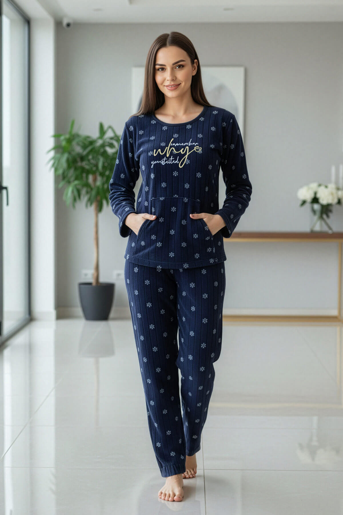 Lacivert Why Desenli Kanguru Cepli Peluş Polar Pijama Takımı
