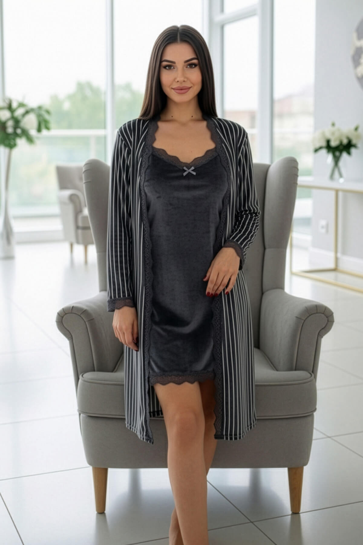 • Zarif tasarımı ve lüks dokusuyla öne çıkan bu özel sabahlıklı gecelik takımı, tamamen ithal kadife kumaştan üretilmiştir. Kadifenin doğal parlaklığı ve yumuşak dokusu sayesinde ciltle temas ettiğinde ipeksi bir his sunar. Premium segmentte yer alan bu takım, hem şıklığı hem de konforu bir arada arayanlar için tasarlanmıştır.