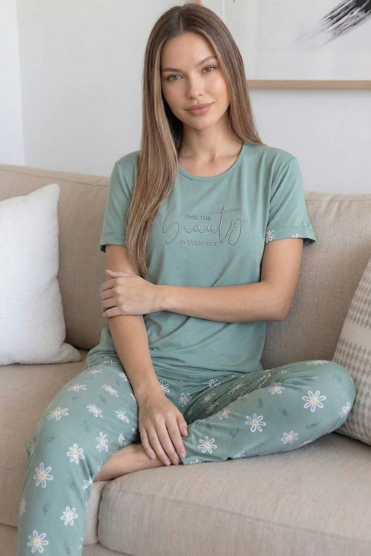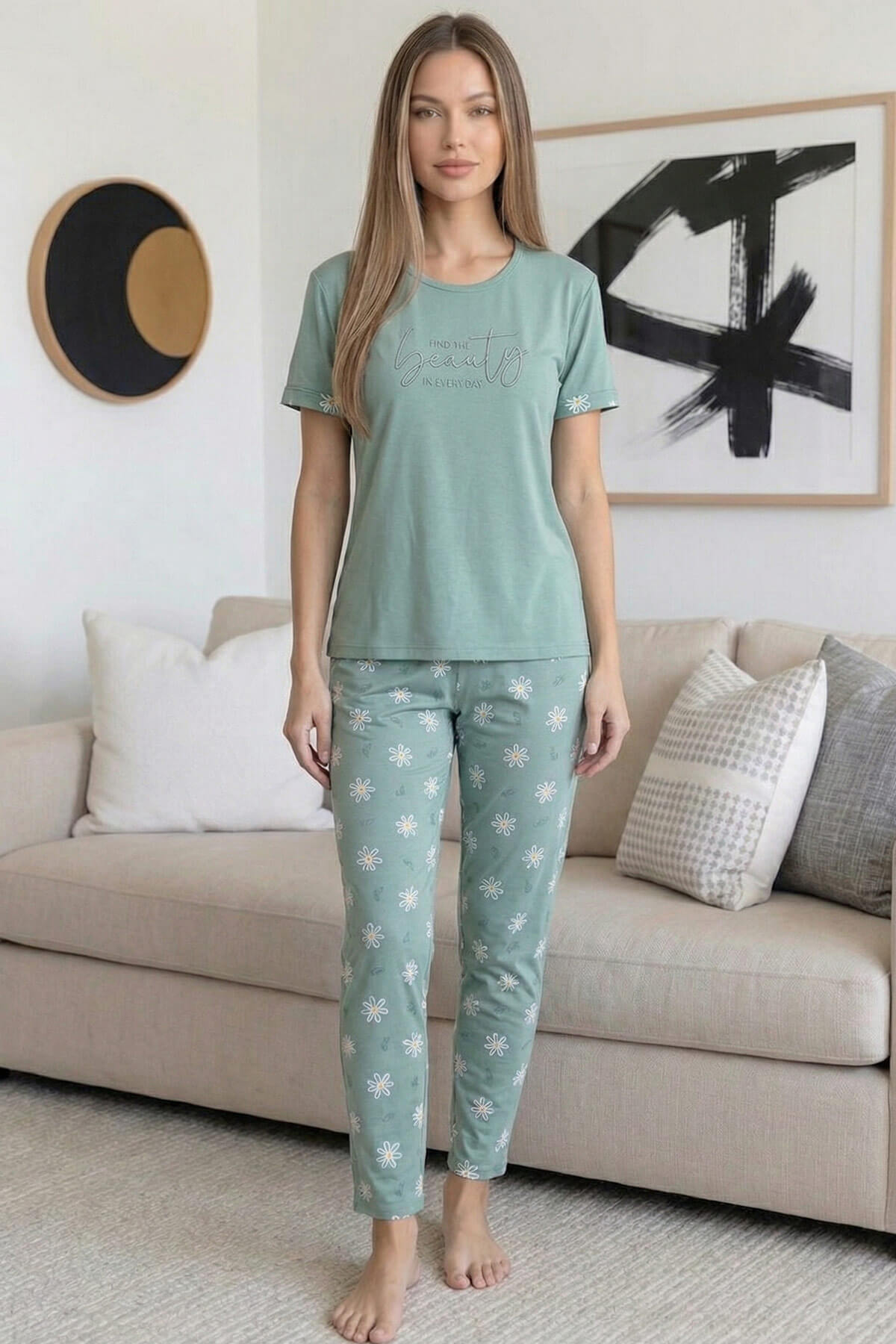 Mint Beauty Desenli Bambu Kısa Kol Kadın Pijama Takımı