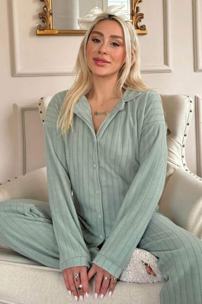 Mint Yeşili Düz Önden Düğmeli Peluş Polar Pijama Takımı - 7