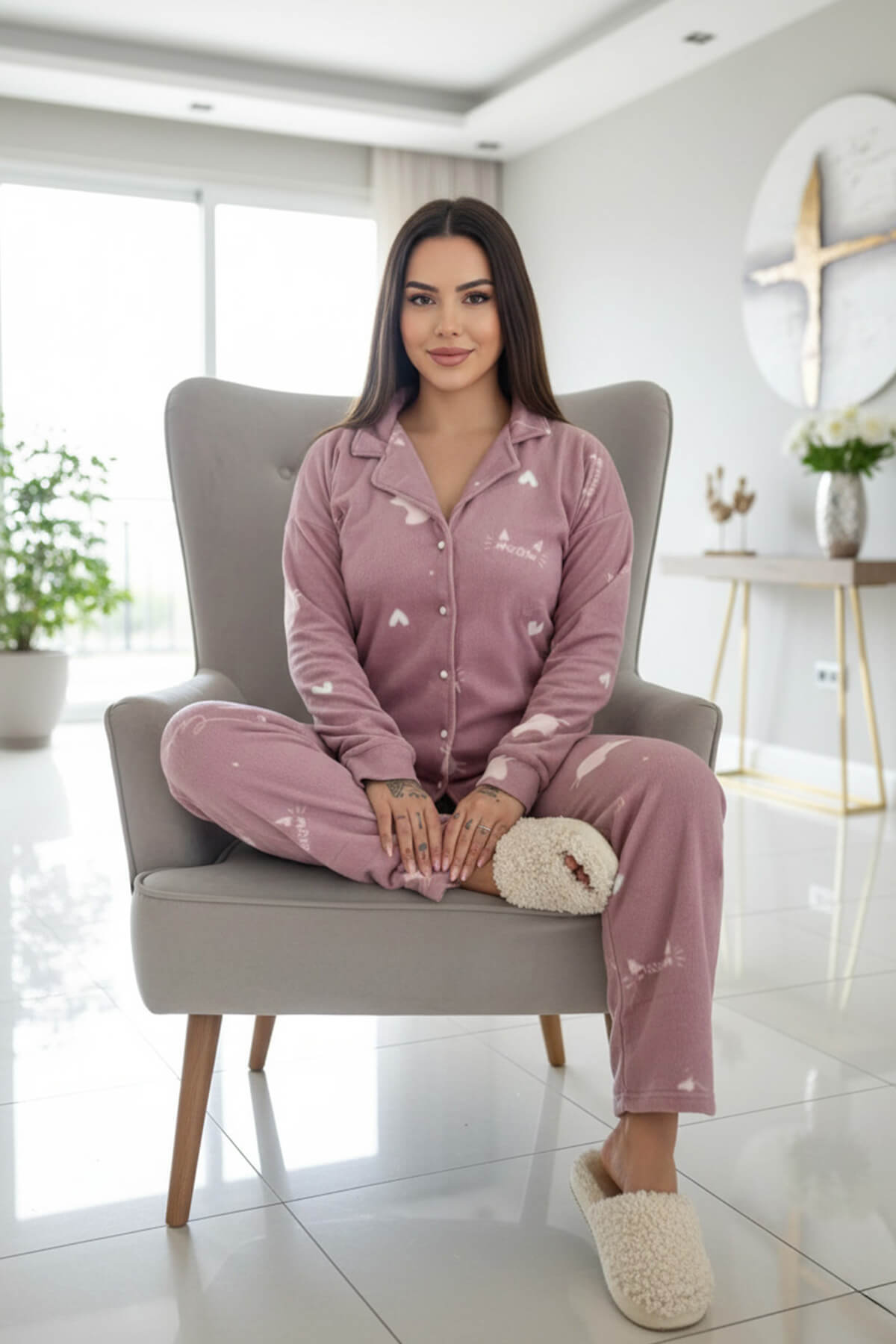 Pembe Cat Desenli Önden Düğmeli Peluş Polar Pijama Takımı