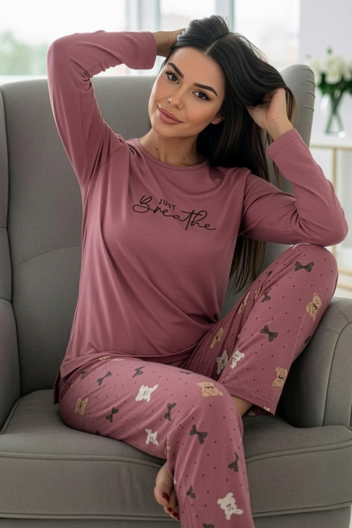 Pudra Breathe Desenli Uzun Kollu Bambu Örme Kadın Pijama Takımı