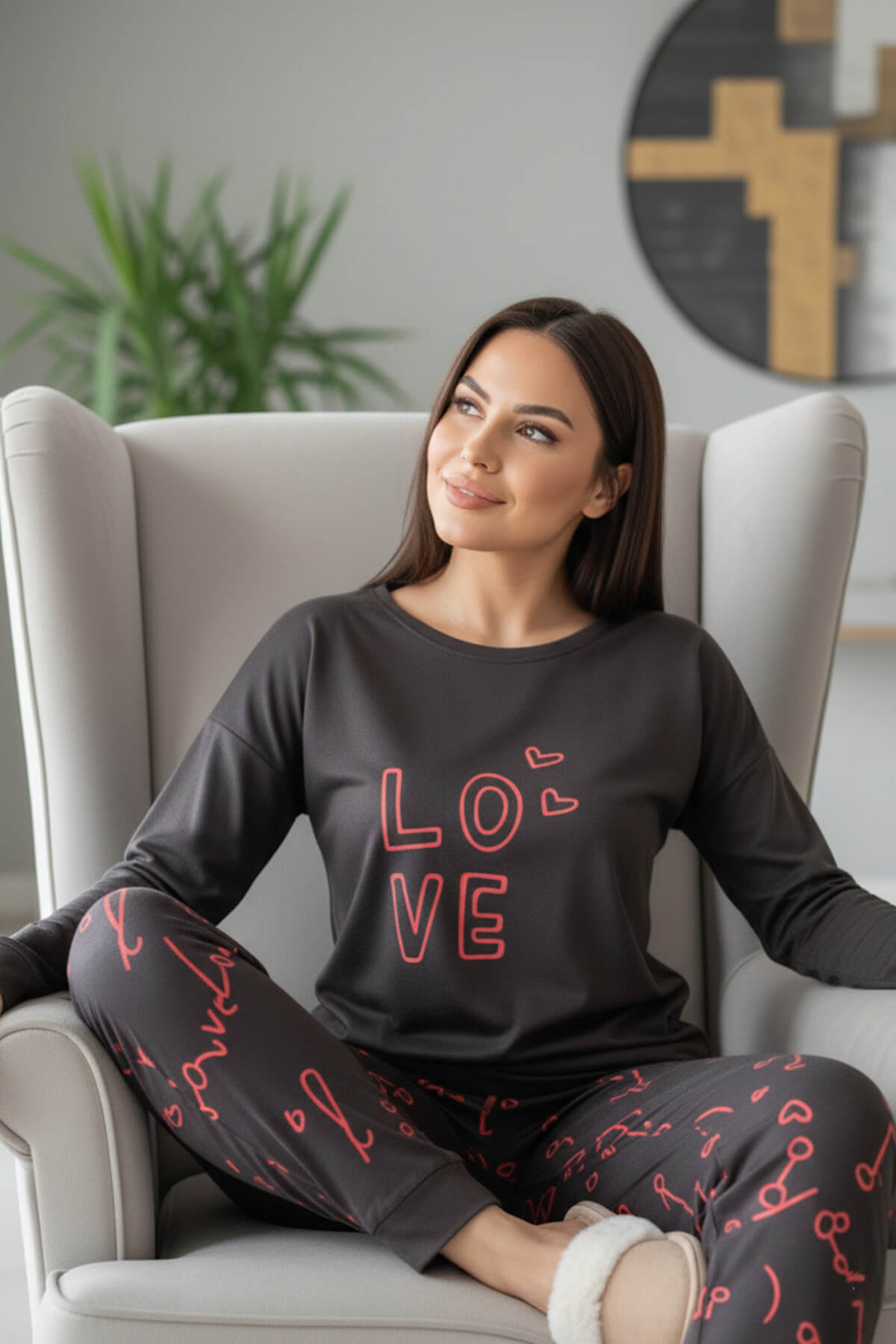Siyah Love Desenli Termal Kadın Pijama Takımı