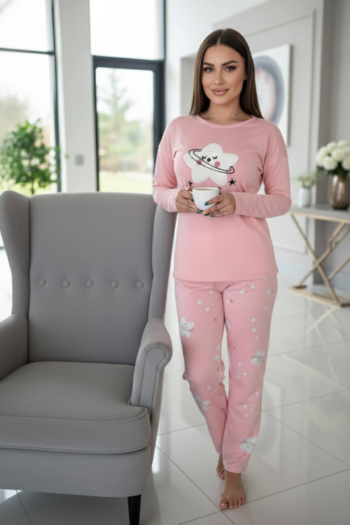 Yumuşak tuşesi sayesinde cilde nazikçe dokunan kumaşı, gün boyu rahat bir his sunarken desenli alt parçalarıyla da enerjik ve modern bir görünüm kazandırır. Sonbahar-kış kullanıma uygun yapısıyla gardırobunuzun vazgeçilmez parçalarından biri olacak.Gündelik ev şıklığı için ideal olan bu pijama takımı, rahatlığı ve tarzı bir arada sunuyor.