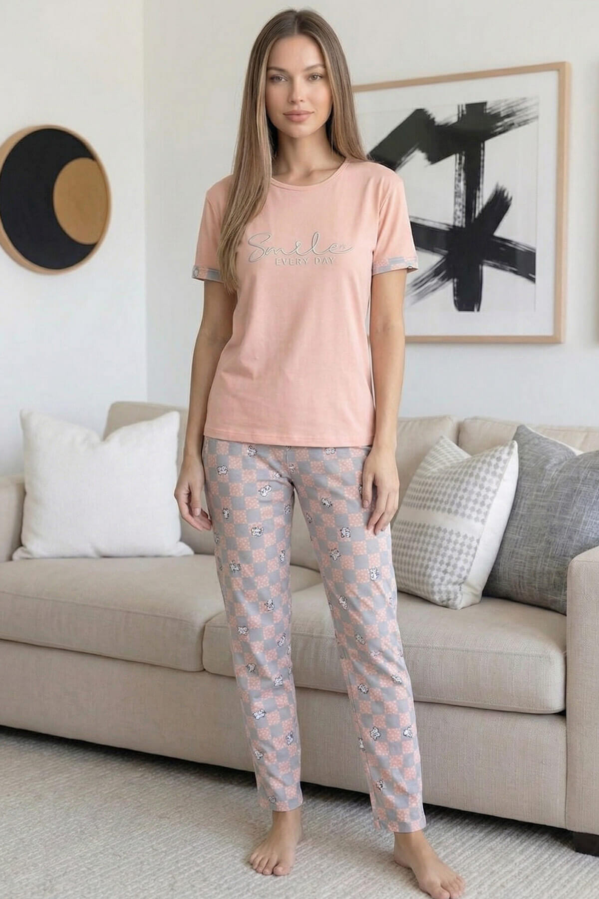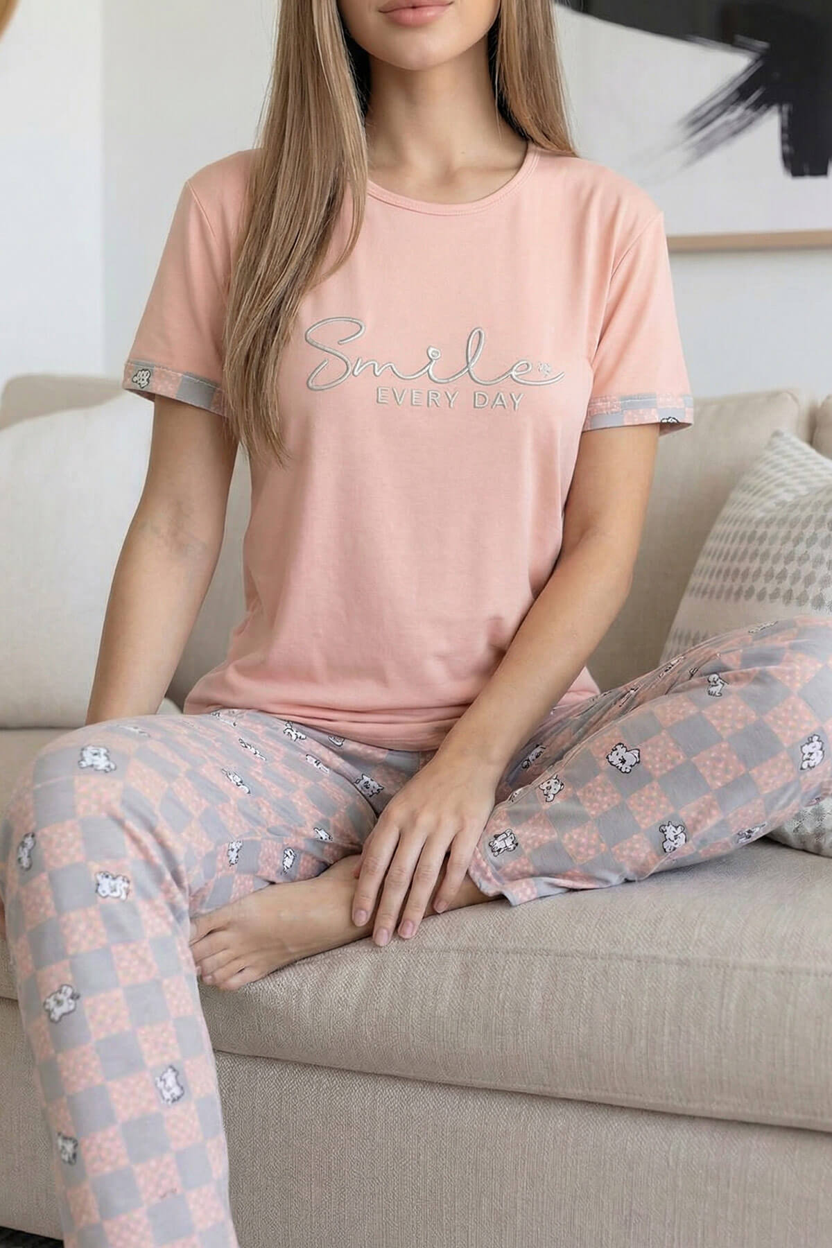 Somon Smile Desenli Bambu Kısa Kol Kadın Pijama Takımı