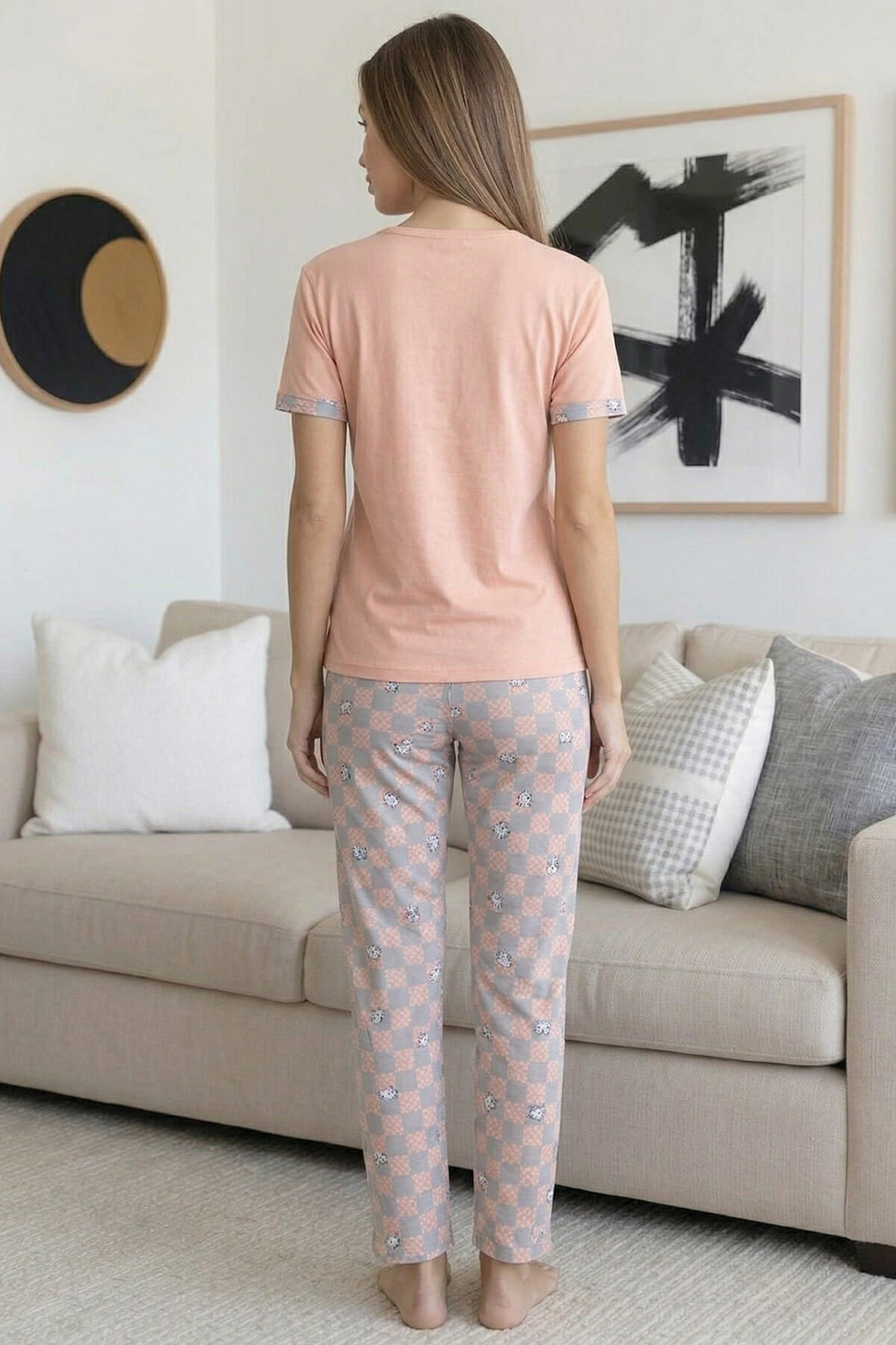 Kısa kollu bisiklet yaka üst tasarımı modern ve sade bir görünüm sunarken; uzun alt pijama rahat kalıbı ile hareket özgürlüğü sağlar. Ev giyimi, uyku ve günlük kullanım için ideal olan bu takım, yumuşak tuşesi sayesinde cilde nazik temas eder.