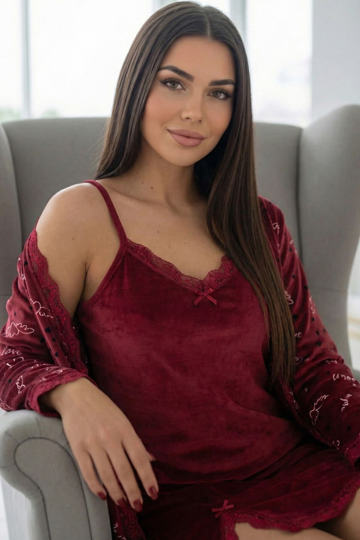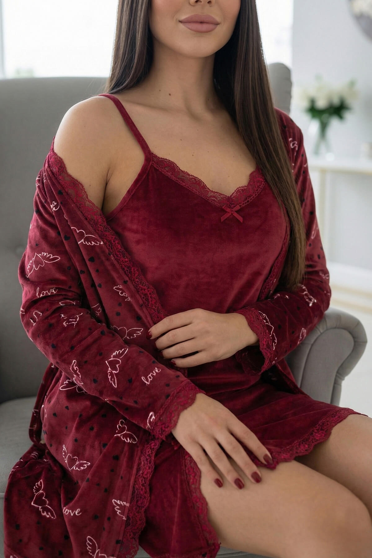 Wine Romance Exclusive Kadife Sabahlıklı Gecelik Kadın Pijama Takımı