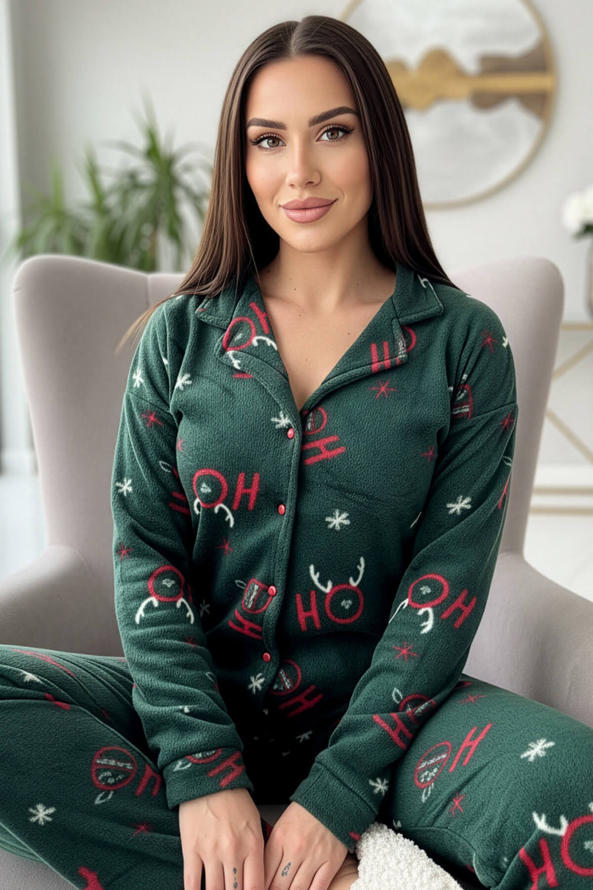 Yeşil Deer Desenli Önden Düğmeli Peluş Polar Pijama Takımı